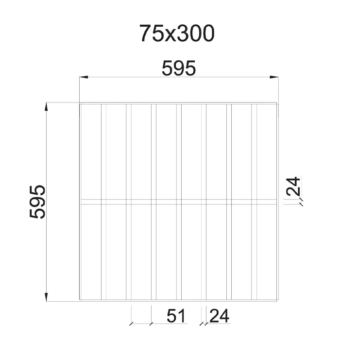 Открытая структура с ячейками 75x300 мм способствует эффективной циркуляции воздуха, улучшая атмосферу в помещении и создавая ощущение легкости и простора. Профиль высотой 34 мм и шириной 24 мм придает потолку четкие геометрические линии, подчеркивая минимализм и элегантность.