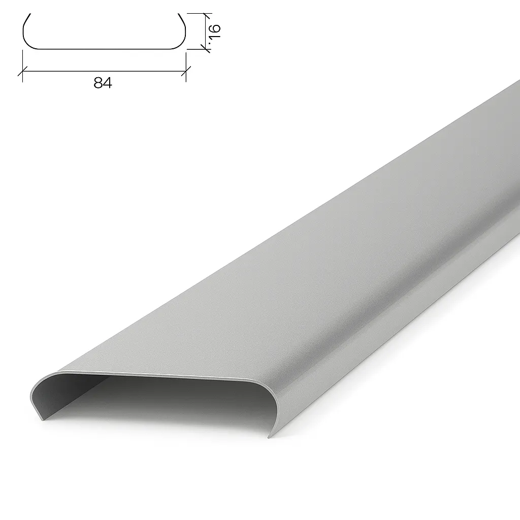 A84A металлик матовый с перфорацией — потолочная алюминиевая рейка шириной 84 мм с шагом 100 мм. Цвет — матовый металлик, монтаж — открытый на гребёнку. Перфорация обеспечивает звукопоглощение и вентиляцию, снижая эхо и улучшая комфорт в помещениях. Применяется в офисах, коридорах, переговорных, зонах приёма и техпомещениях.