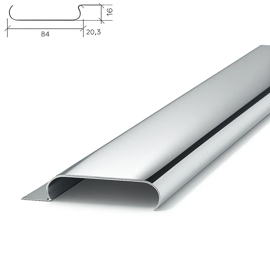 A84AC суперхром — алюминиевая рейка 84 мм с шагом 100 мм и закрытым монтажом, с зеркальным покрытием «суперхром». Создаёт эффект отражающего потолка, визуально расширяя пространство. Идеальна для интерьеров с премиум-отделкой: холлы, салоны, бутики, приёмные зоны, гостиницы.