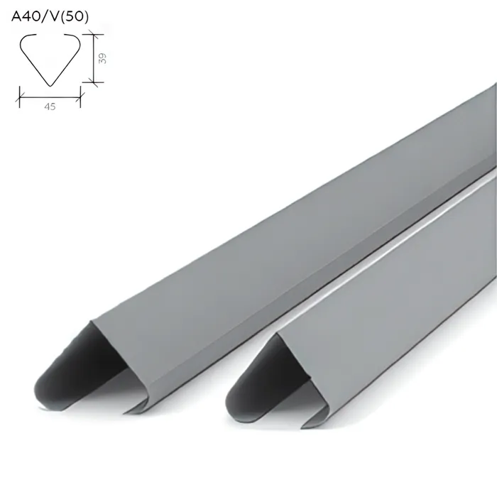 Профиль A40V в цвете металлик — алюминиевая рейка с V-образной формой и шириной 40 мм. Металлизированное покрытие придаёт потолку строгий и технологичный внешний вид. Рекомендуется для офисов, ТЦ, производственных и административных объектов.