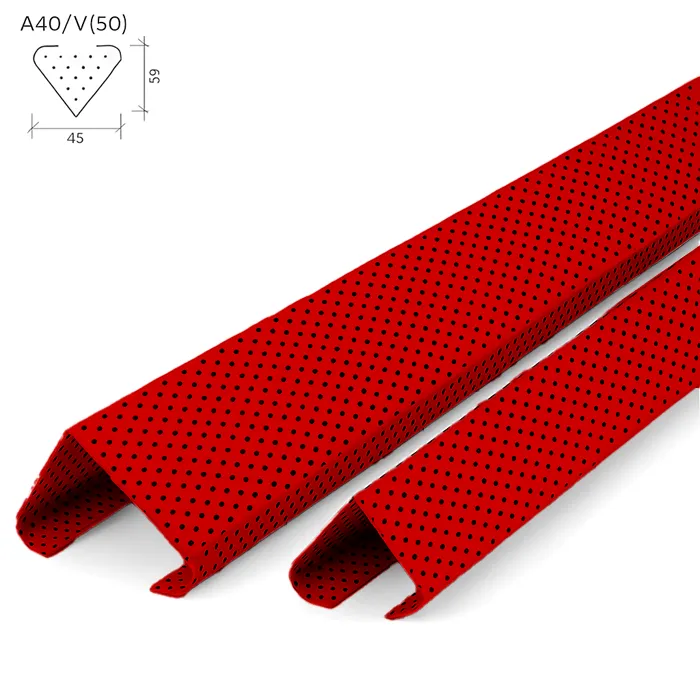 Профиль A40V с V-образной геометрией, перфорацией и окраской по каталогу RAL — это алюминиевая рейка 40 мм, сочетающая архитектурную выразительность и техническую функциональность. Перфорация Ø1,5 мм обеспечивает циркуляцию воздуха и звукопоглощение, а цвет под заказ позволяет вписаться в любой дизайн.